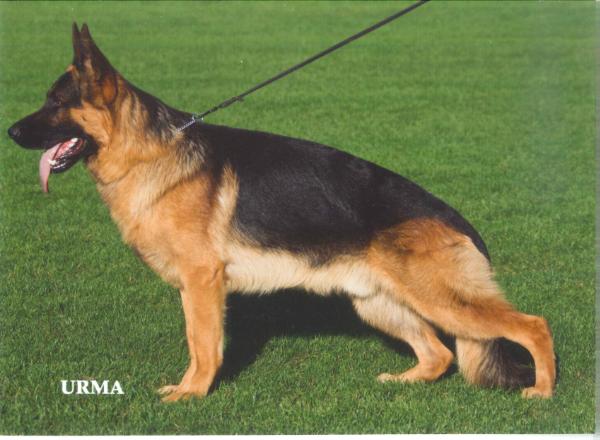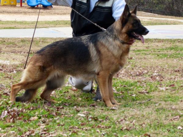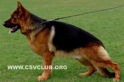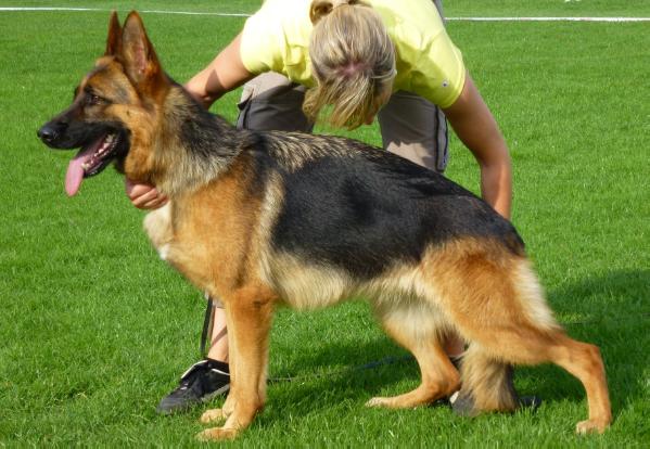 Large, powerful and substantial male with a very good gender markings. Very well pigmented, expressive head with wonderful power and dark eyes. High set withers and firm back. The croup should be a little longer. Well angled front, appropriate chest proportions. Deep and excellently angulated hindquarters. Steps straight in front and behind. Long reaching and powerful movements with very good firmness... Courage and fighting drive pronounced, letting go.