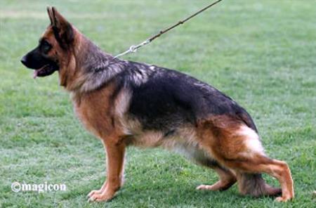 Very well pigmented, over medium size, powerful, substantial, slightly elongated, dry, firm, very good expression. High, long withers, straight, firm back, good length and position of the croup. Very well angulated fore, hindquarters, balanced chest ratios, straight front, straight stride, fluid gait with powerful follow-through and free stride. Secure nature, TSB pronounced; does not let off.