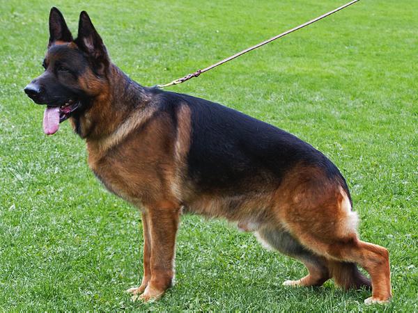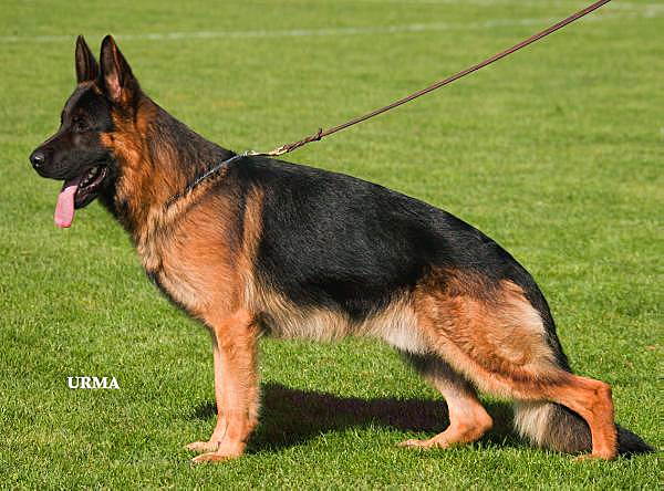 Large, medium strong, typey, expressive, full-bodied, very well pigmented. Powerful, expressive head with excellent dark mask and beautiful dark eyes. High withers, firm straight back, good length and position of croup, good forehand angulation, stressed rear spar with correct front. Slightly narrow which she gradually demonstrates excellent gait in an absolutely correct position of equilibrium, with strong supply and free precedence. TSB pronouncedly;.