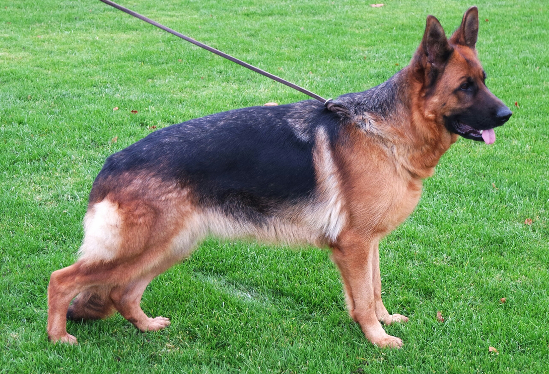 Groß, kräftig, richtiges Verhältnis. Hoher Widerrist, gute Oberlinie, richtige Kruppe in Länge und Lage, sehr gute Winkelungen der Vor- und Hinterhand, ausgeglichene Brustverhältnisse, korrekte Front. Bei gerader Schrittfolge zeigt sie sehr raumgreifende Gänge. TSB ausgeprägt; läßt ab.