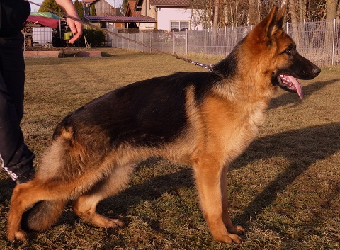 Groß, kräftig, richtiges Verhältnis. Hoher Widerrist, gute Oberlinie, richtige Kruppe in Länge und Lage, sehr gute Winkelungen der Vor- und Hinterhand, ausgeglichene Brustverhältnisse, korrekte Front. Bei gerader Schrittfolge zeigt ...Big, strong, real money. High withers, good topline, correct croup length and location, very good angulations in front and rear, balanced chest proportions, correct front. With even step sequence it is very space-consuming transitions. TSB pronounced, lets out.